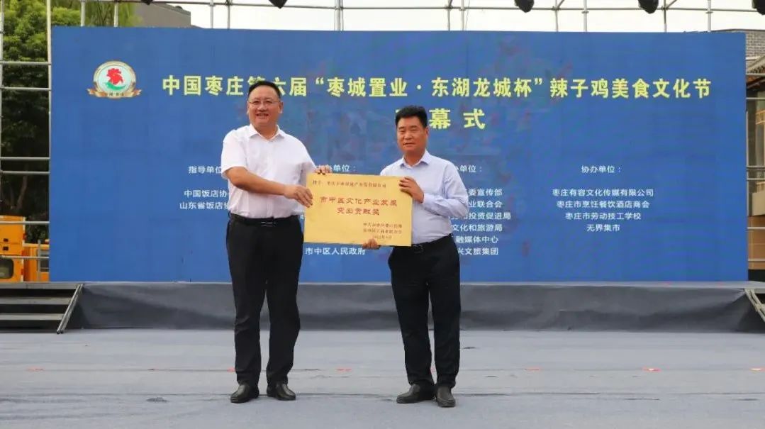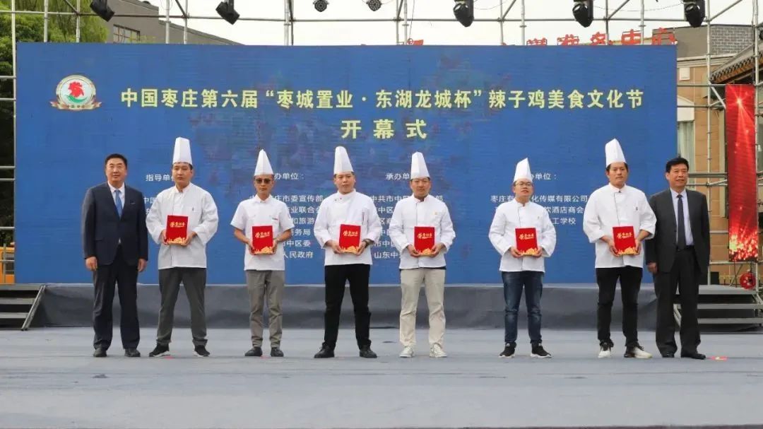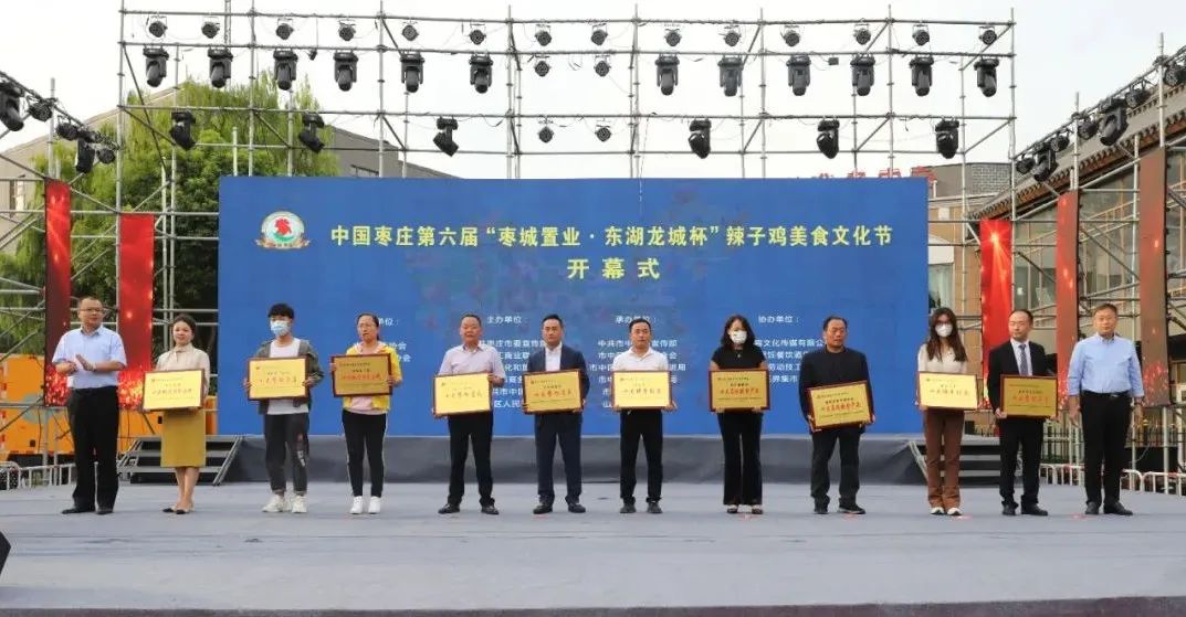 開幕式上,中國飯店協會副會長、中國飯店協會名廚委員會主席石萬榮發(fā)來了祝賀視頻。企業(yè)家代表山東棗城置業(yè)有限公司董事長殷允夷致賀詞。與會領導分別為“全雞宴”美食賽獲獎團隊、首屆“慢品市中”美食評選獲獎單位、市中區(qū)文化產業(yè)發(fā)展突出貢獻獎獲獎單位頒獎,并共同啟動第六屆辣子雞美食文化節(jié)。
