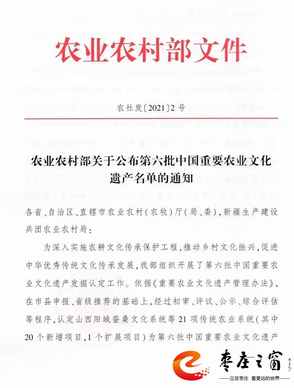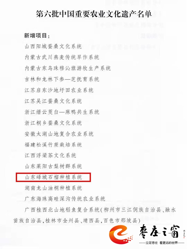 11月16日,農(nóng)業(yè)農(nóng)村部公布第六批中國(guó)重要農(nóng)業(yè)文化遺產(chǎn)名單,認(rèn)定山西陽(yáng)城蠶桑文化系統(tǒng)等21項(xiàng)傳統(tǒng)農(nóng)業(yè)系統(tǒng)為第六批中國(guó)重要農(nóng)業(yè)文化遺產(chǎn),其中嶧城石榴種植系統(tǒng)入選。